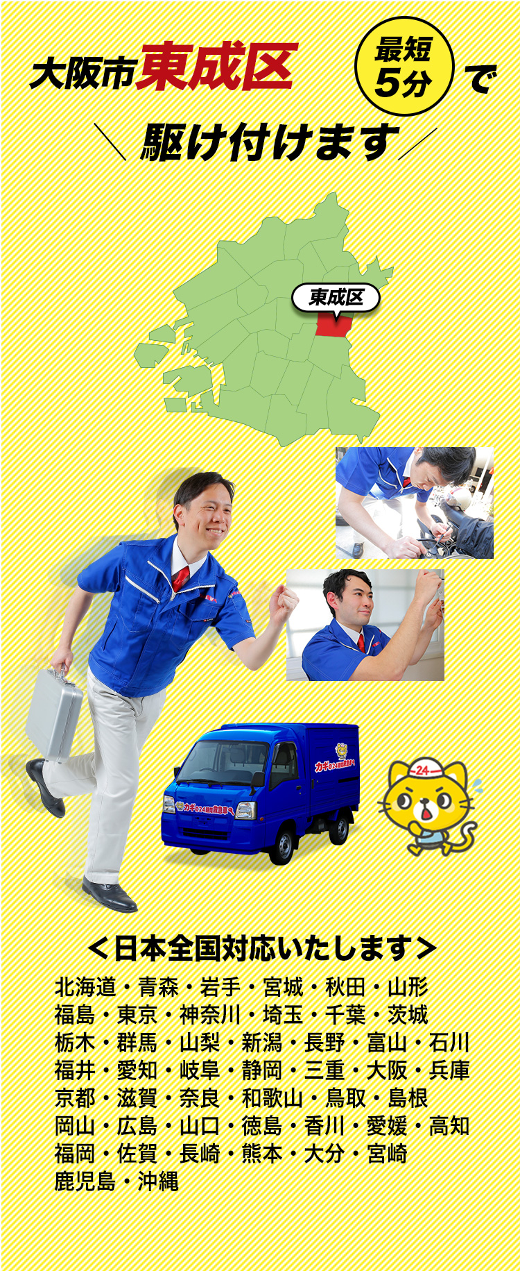 東成区で評価の高い「カギの出張24時間」は玉造、今里エリアで迅速に対応いたします。わかりやすい事前説明と正確な見積もりを通じて、お客様の信頼を得ることを心がけています。地元に根ざした丁寧なサービスを提供し、施工後はお客様の意見を大切にし、サービス品質を継続的に改善しています。